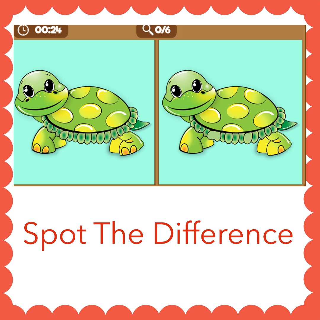 Spot the Difference: Two Cartoon Pictures Will Be Displayed On The Screen. Differences Between The Pictures Should Be Spotted As Quickly As Possible. The Complexity Increases As Per The Performance Of The Previous Activity. This Activity Helps To Improve Selective Attention, Visual Perception And Discrimination Skills.